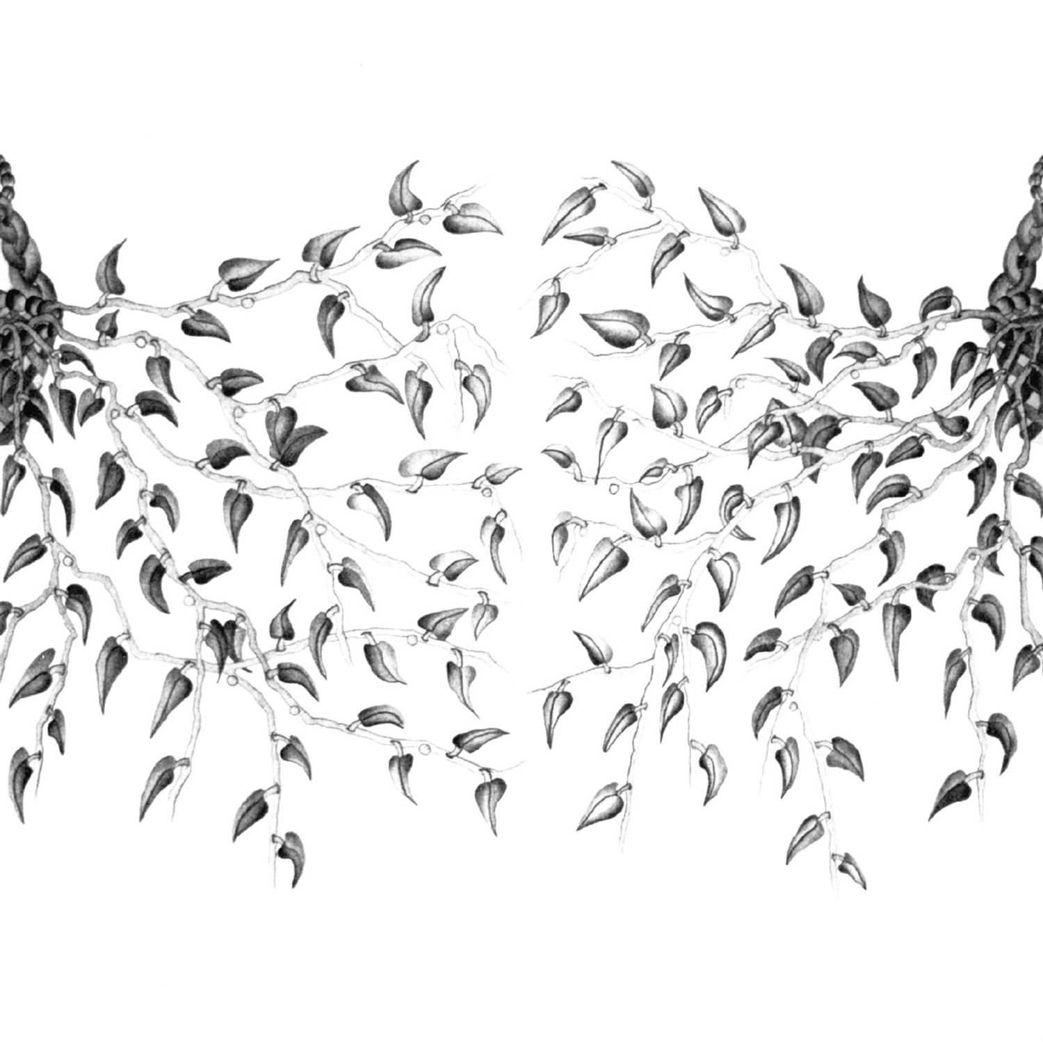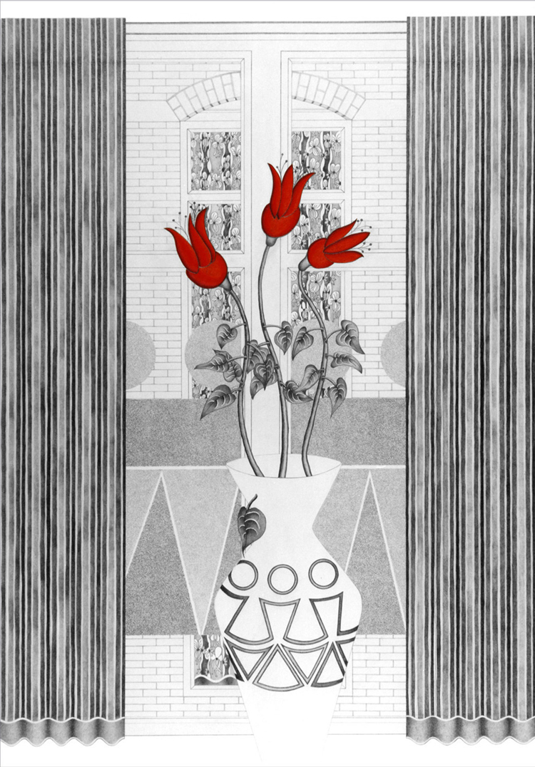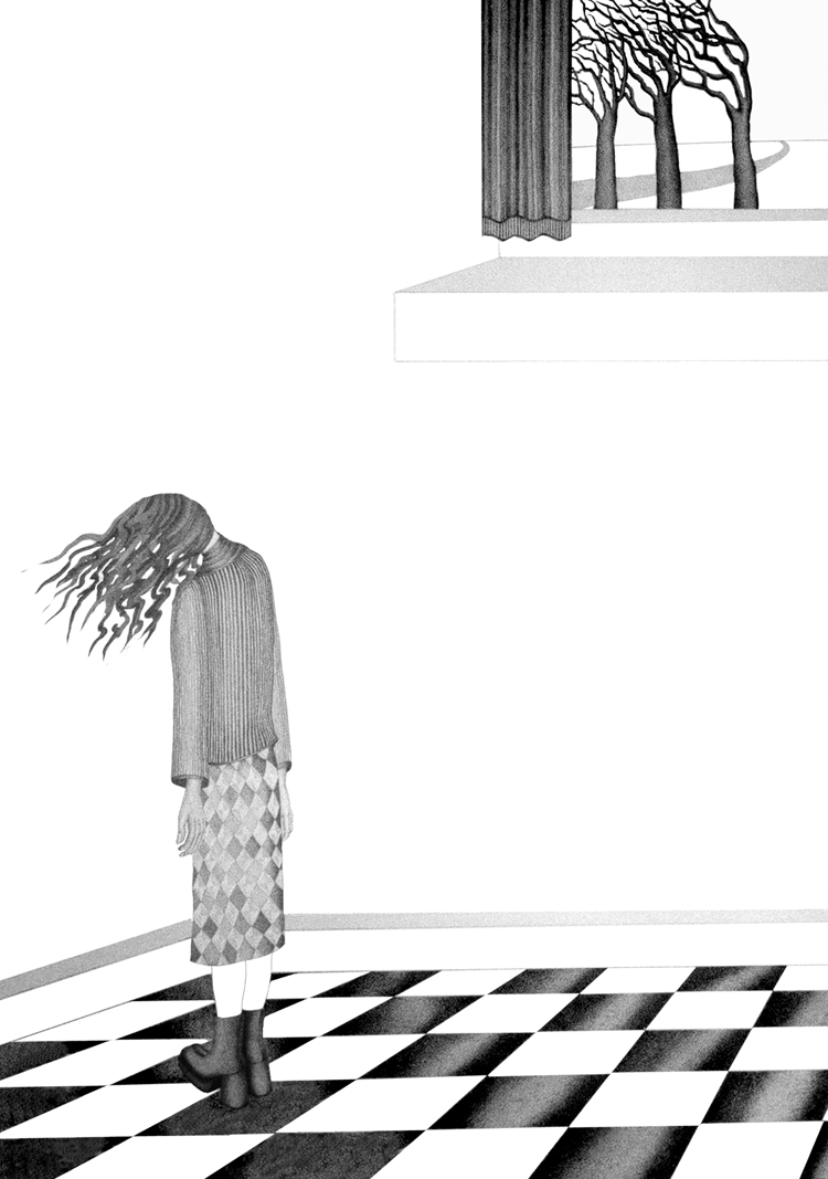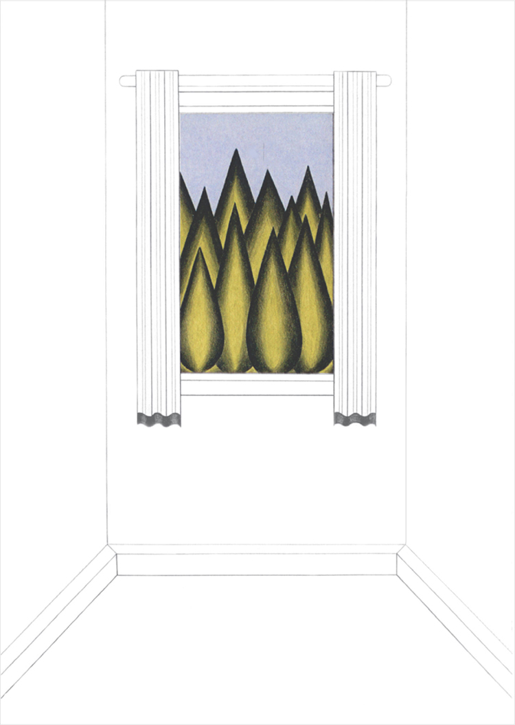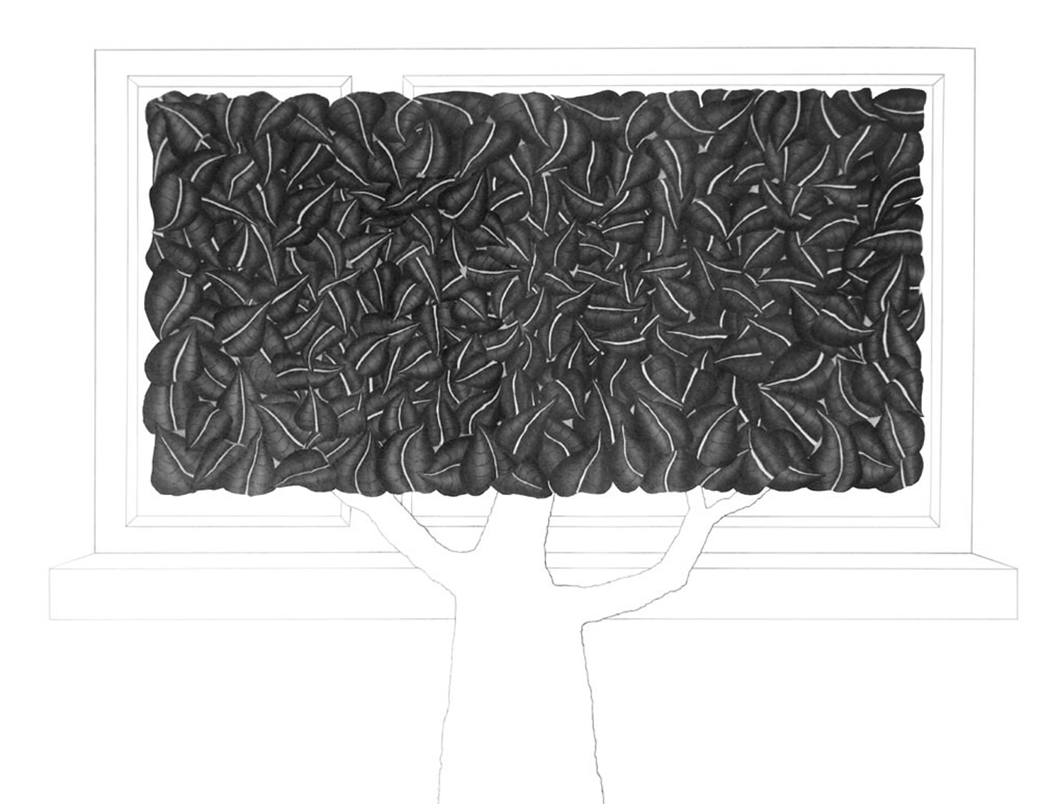 Voor mijn figuratieve potloodtekeningen op papier, begon ik met het aanschouwen van mijn buitenwereld. Achter het raam van mijn atelier dat uitkijkt op een park met bomen en wandelpaden, tekende ik mijn kamer in relatie tot het uitzicht.