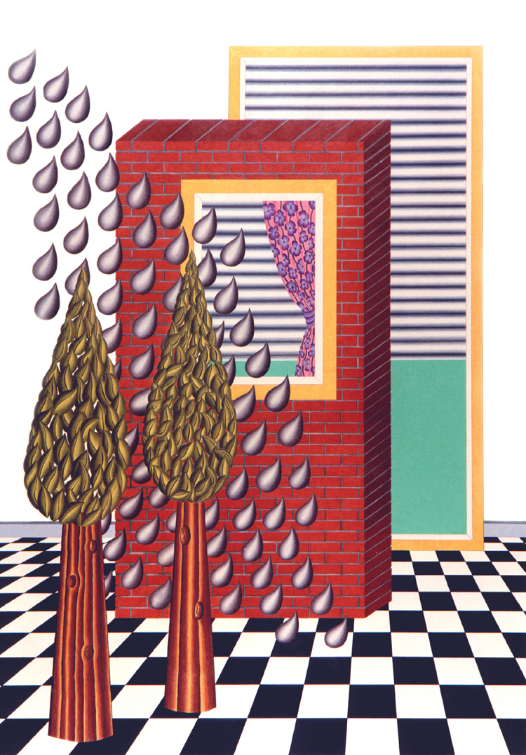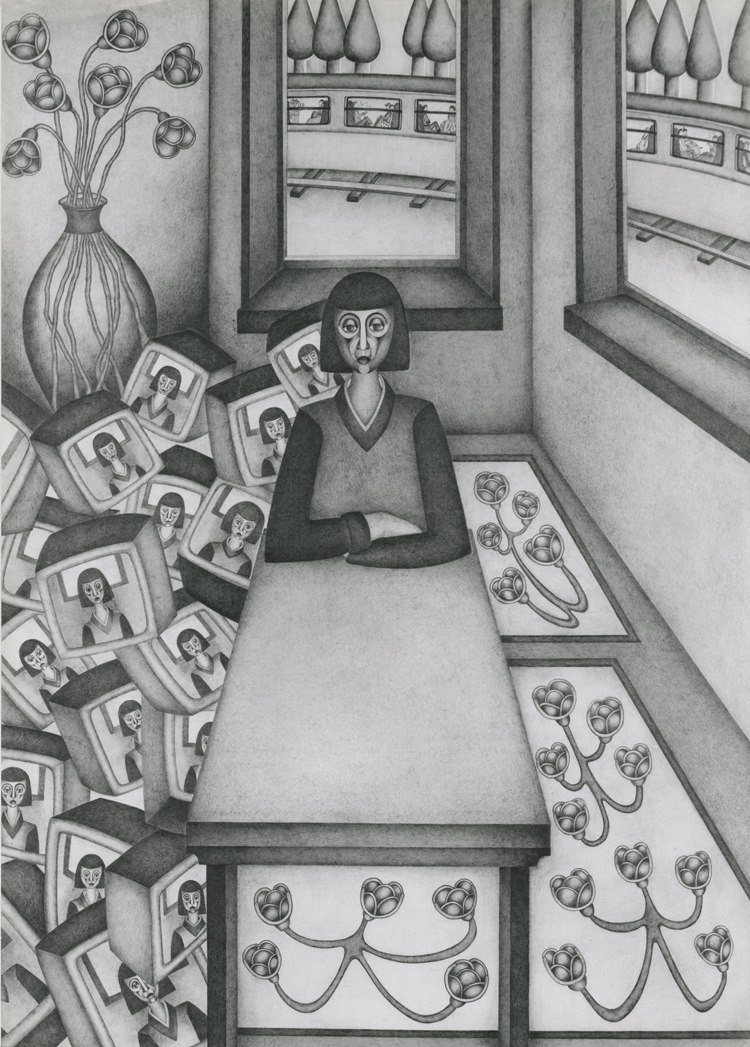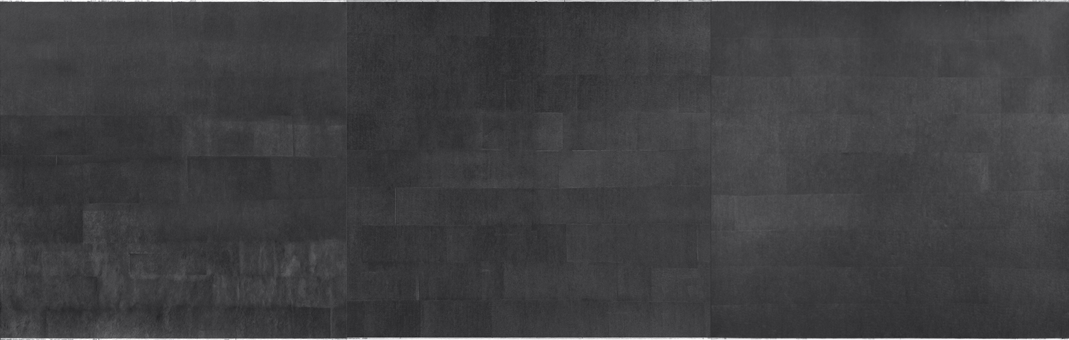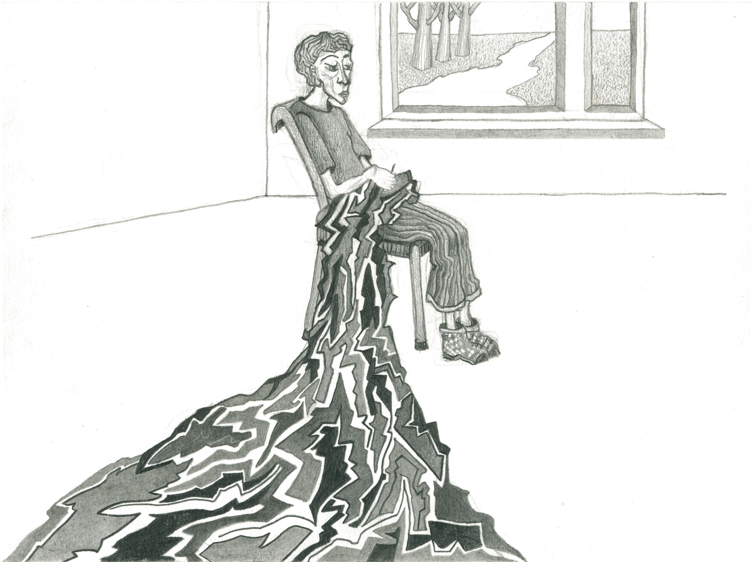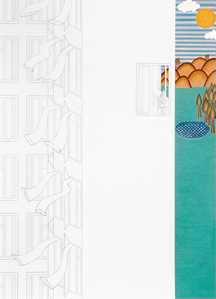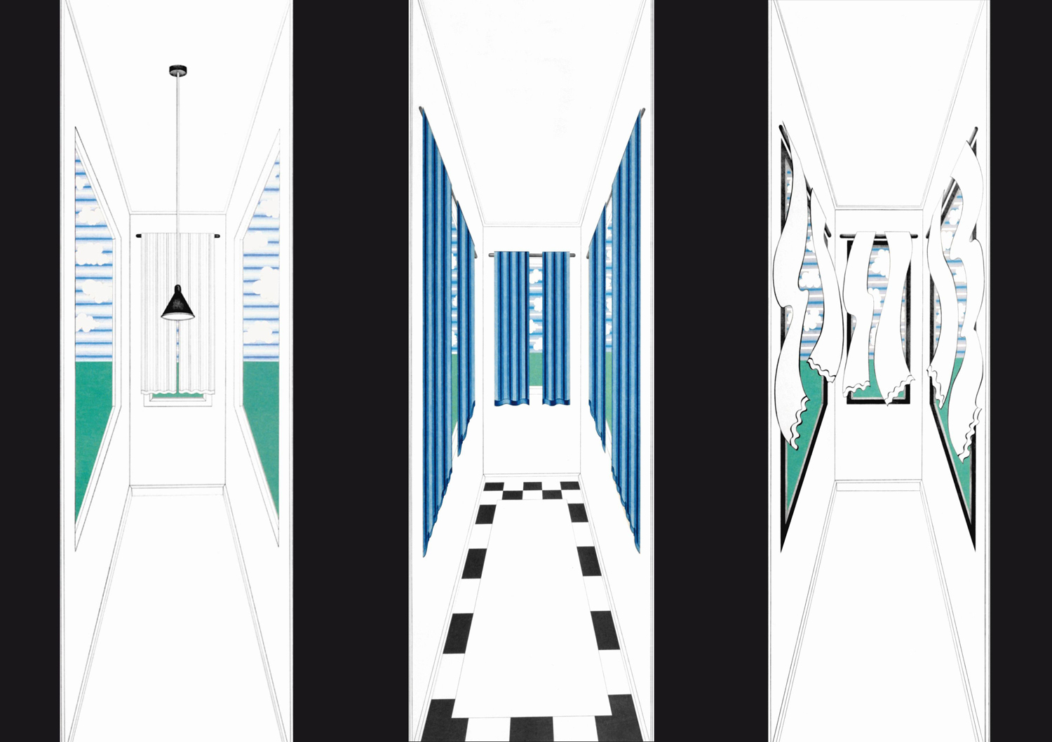 Voor mijn figuratieve potloodtekeningen op papier, begon ik met het aanschouwen van mijn buitenwereld. Achter het raam van mijn atelier dat uitkijkt op een park met bomen en wandelpaden, tekende ik mijn kamer in relatie tot het uitzicht.